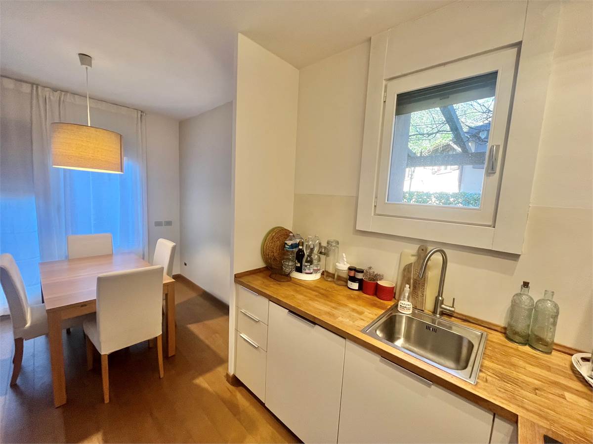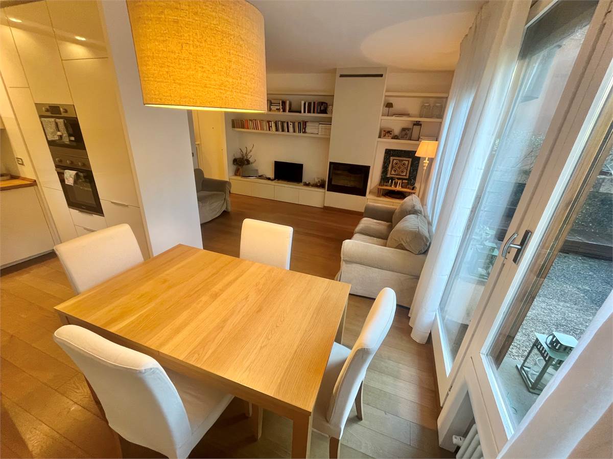 L'ingresso si apre su un luminoso soggiorno con zona pranzo, impreziosito da camino e con accesso diretto all'area esterna, ideale per momenti di relax e convialità. Completa la zona giorno un angolo cottura funzionale.