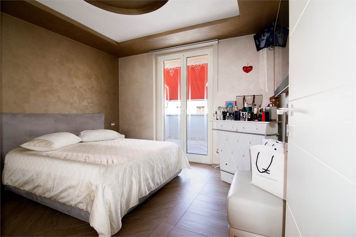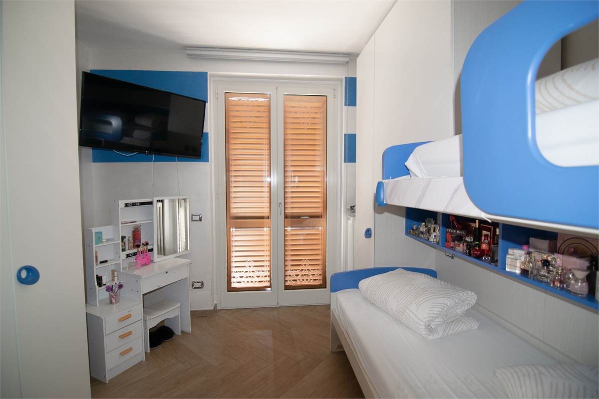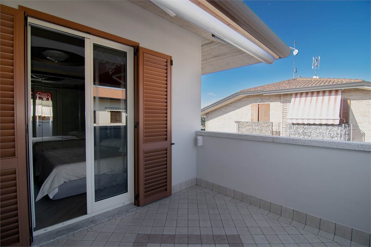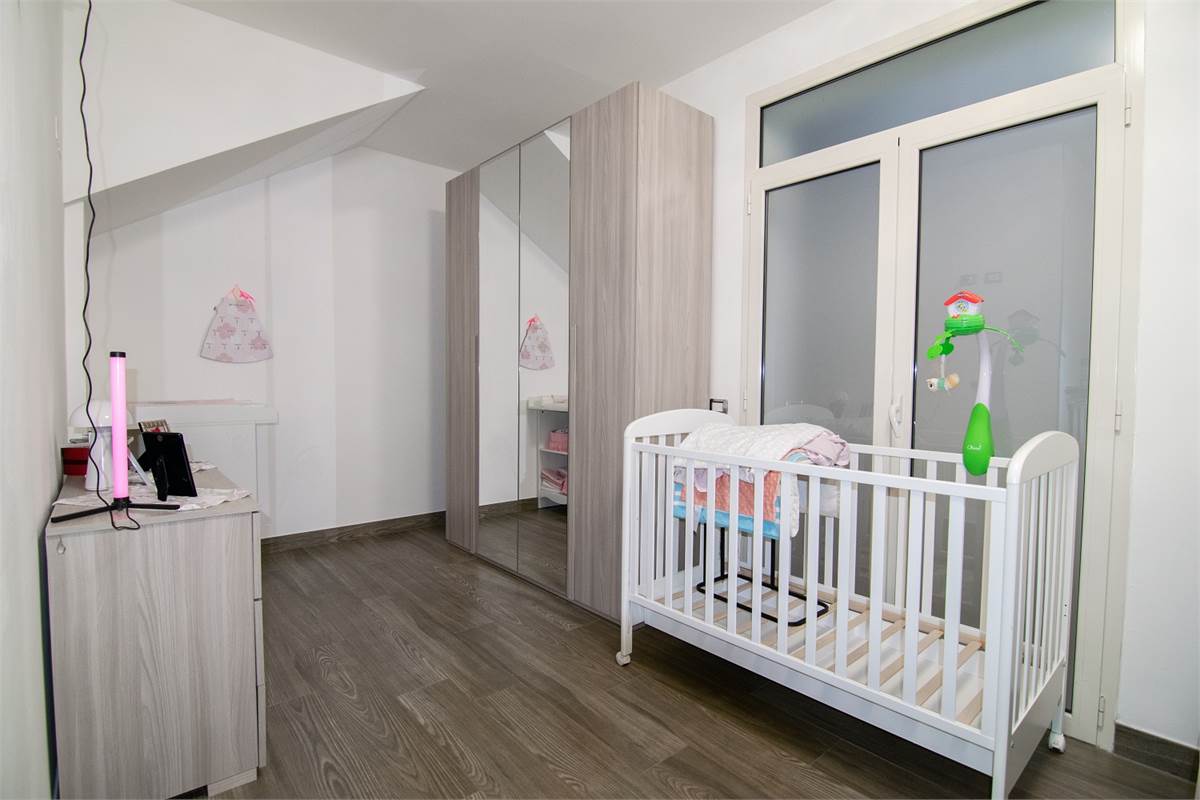 L’appartamento al primo piano, con ingresso indipendente, è costituito da un soggiorno con angolo cottura e accesso diretto sull’ampio terrazzo; due camere da letto luminose con terrazzo; e un bagno con balcone.