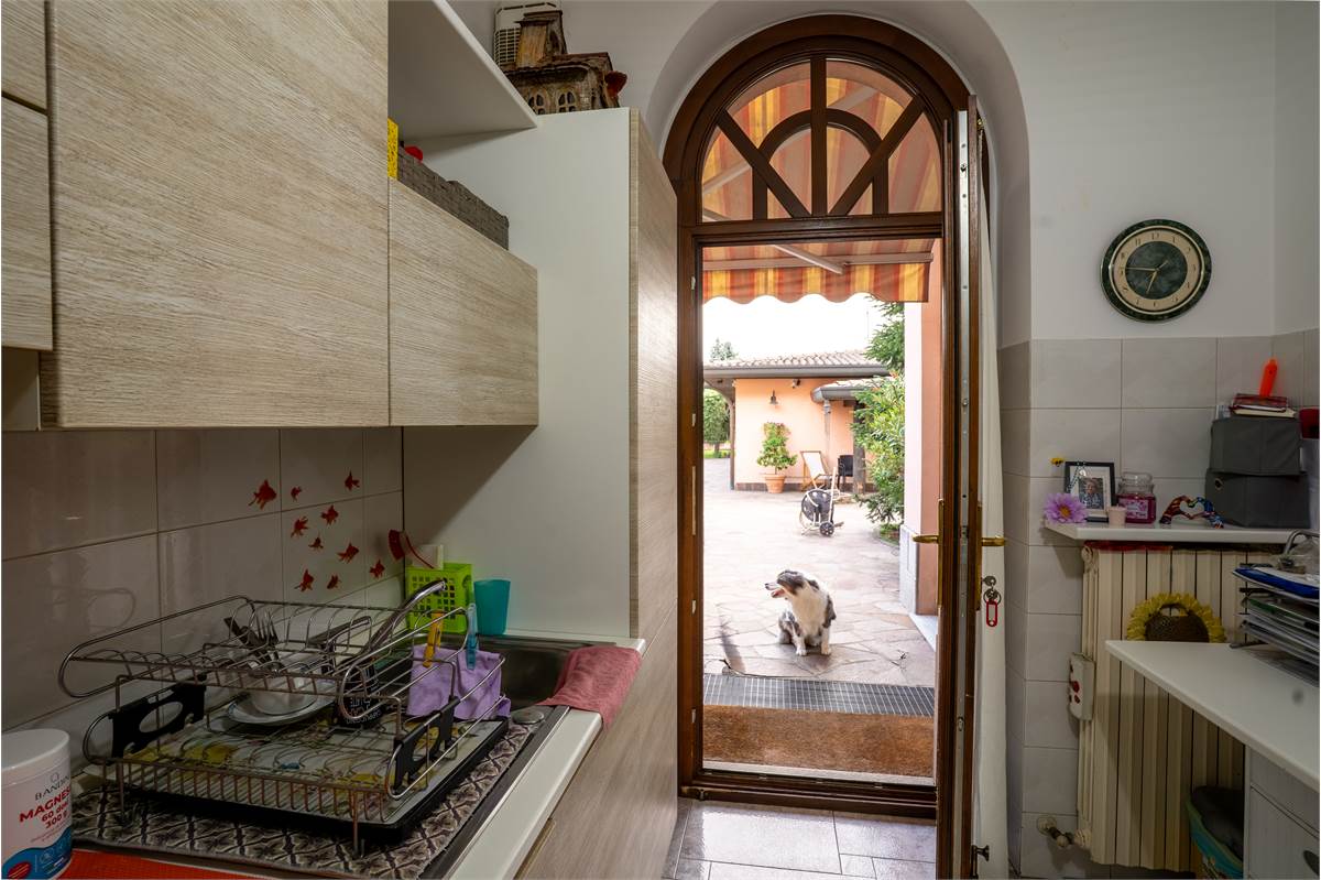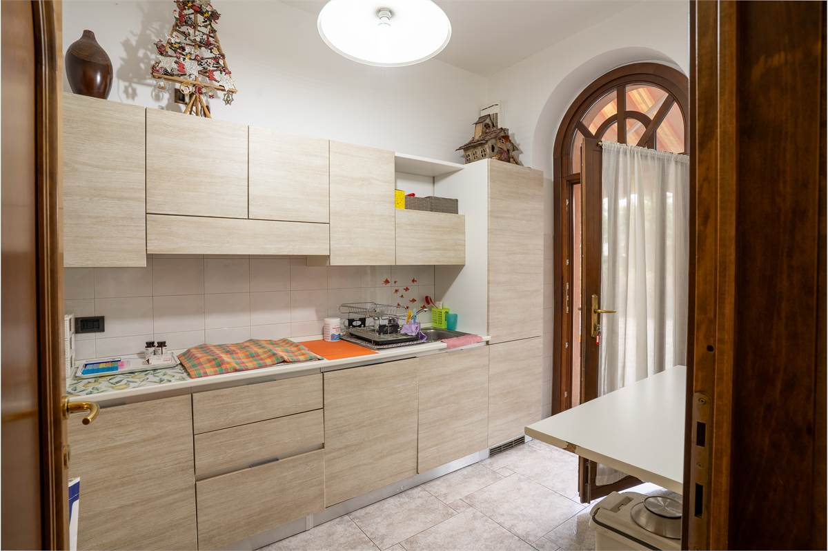 al PIANO TERRA, l'ingresso principale con pavimento in pietra naturale conduce ad un ampio e luminoso soggiorno, caratterizzato da una stupenda colonna in mosaico posata a mano, una luminosa cucina abitabile con porte finestre che si affacciano sul patio esterno, un bagno ed un bilocale con cucina e bagno separati per ospiti o familiari;