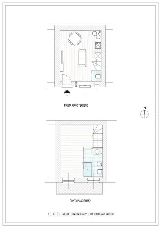 al piano terra troviamo soggiorno con cucina a vista e bagnetto di servizio, mentre al piano superiore, collegato da scala interna, si accede alla camera matrimoniale, al bagno padronale e al balcone.