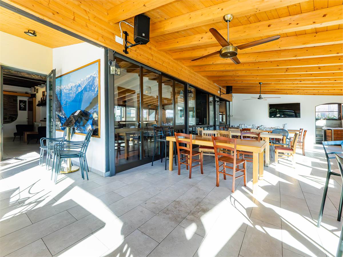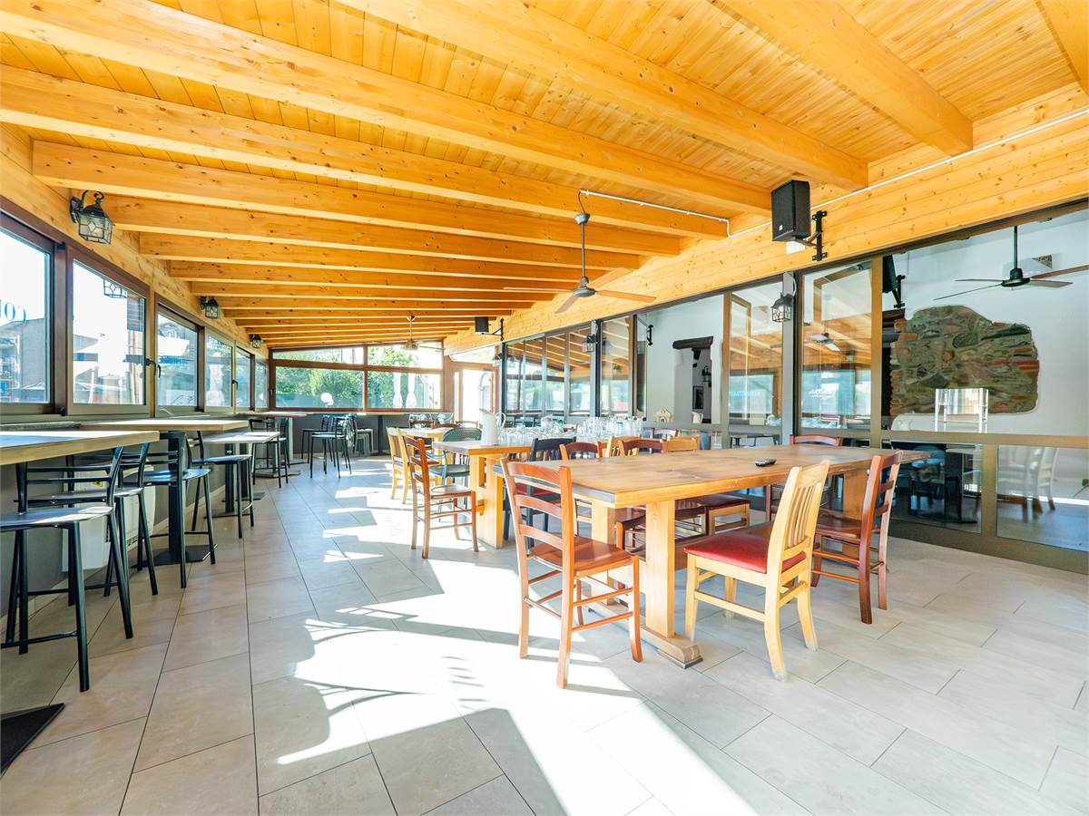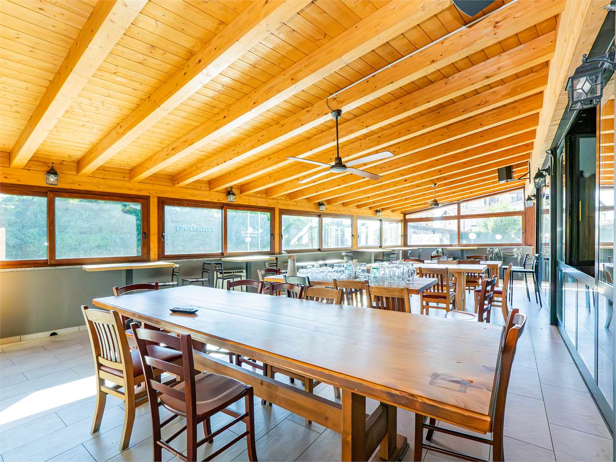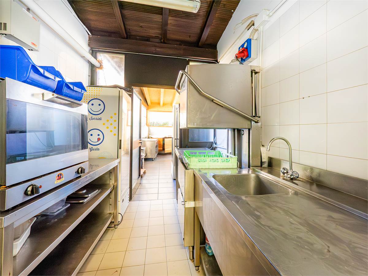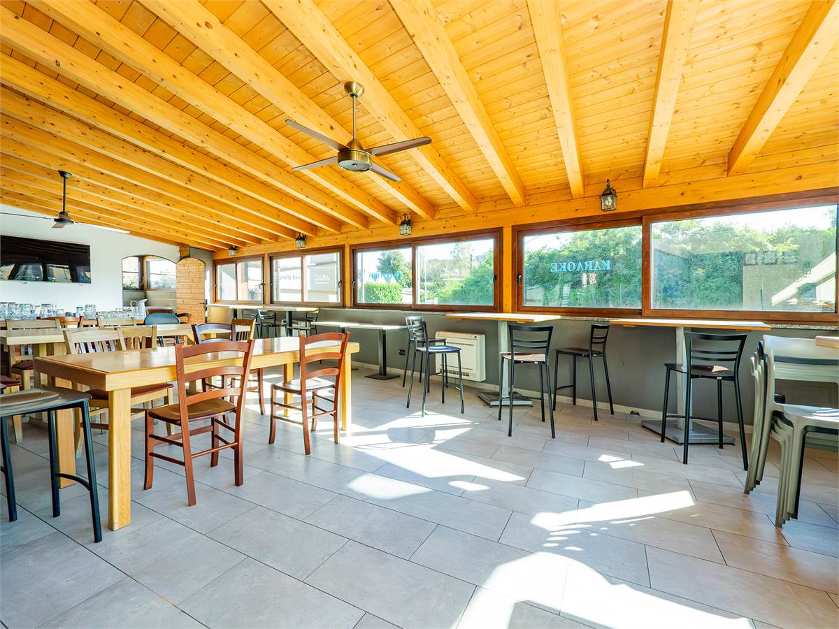 L'immobile è composto da tre sale interne finemente arredate di cui una adibita a bar; un'ampia veranda coperta e climatizzata, utilizzabile tutto l'anno, anche durante l'estate grazie alla perfetta ventilazione e luminosità; una cucina professionale a vista, ampia e perfettamente attrezzata con doppio ingresso; un magazzino/spogliatoio; un ripostiglio ed un bagno organizzato con suddivisione uomo/donna.