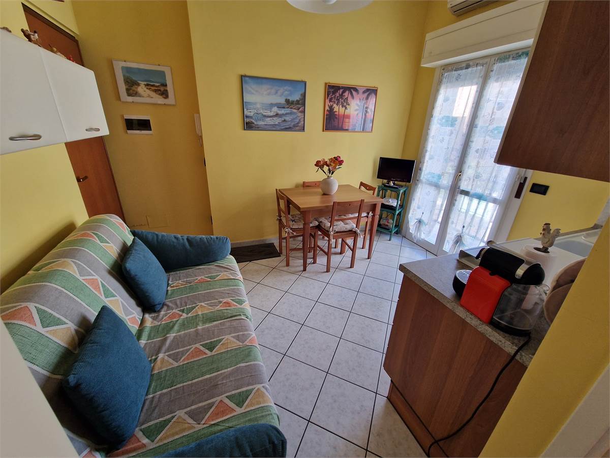 Internamente la disposizione è la seguente: ingresso in soggiorno con cucina a vista ed accesso al balcone, camera matrimoniale con balcone vista mare, bagno completo di box doccia e finestra.