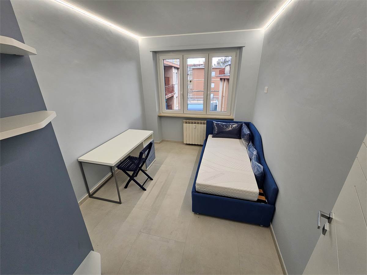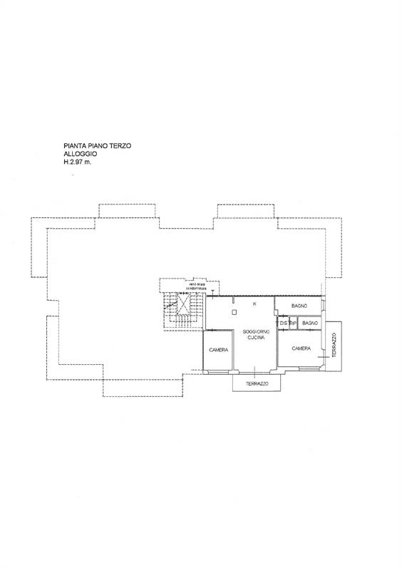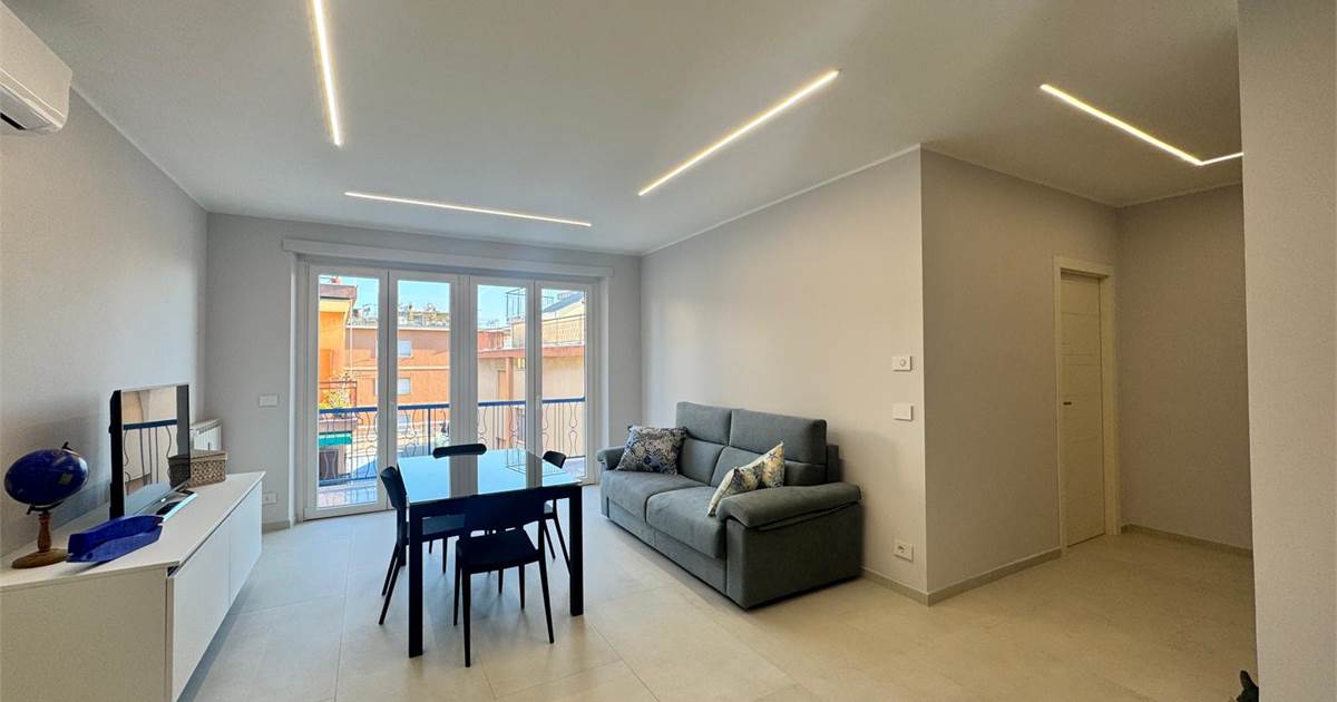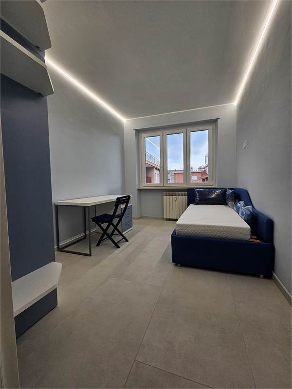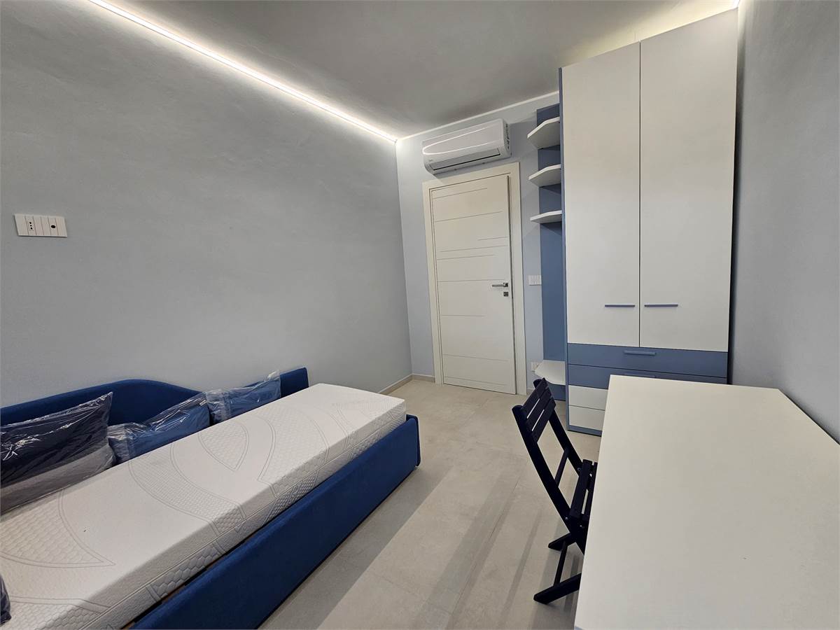 L’immobile, situato al terzo ed ultimo piano di una palazzina in ottime condizioni, si sviluppa su una superficie di 87 mq ed è così composto: ingresso, luminoso soggiorno con cucina a vista, disimpegno, pratico ripostiglio, camera matrimoniale, cameretta e doppi servizi (un finestrato ed uno cieco).