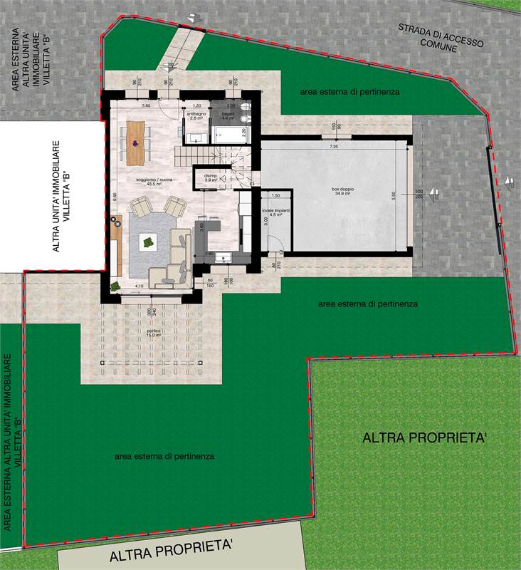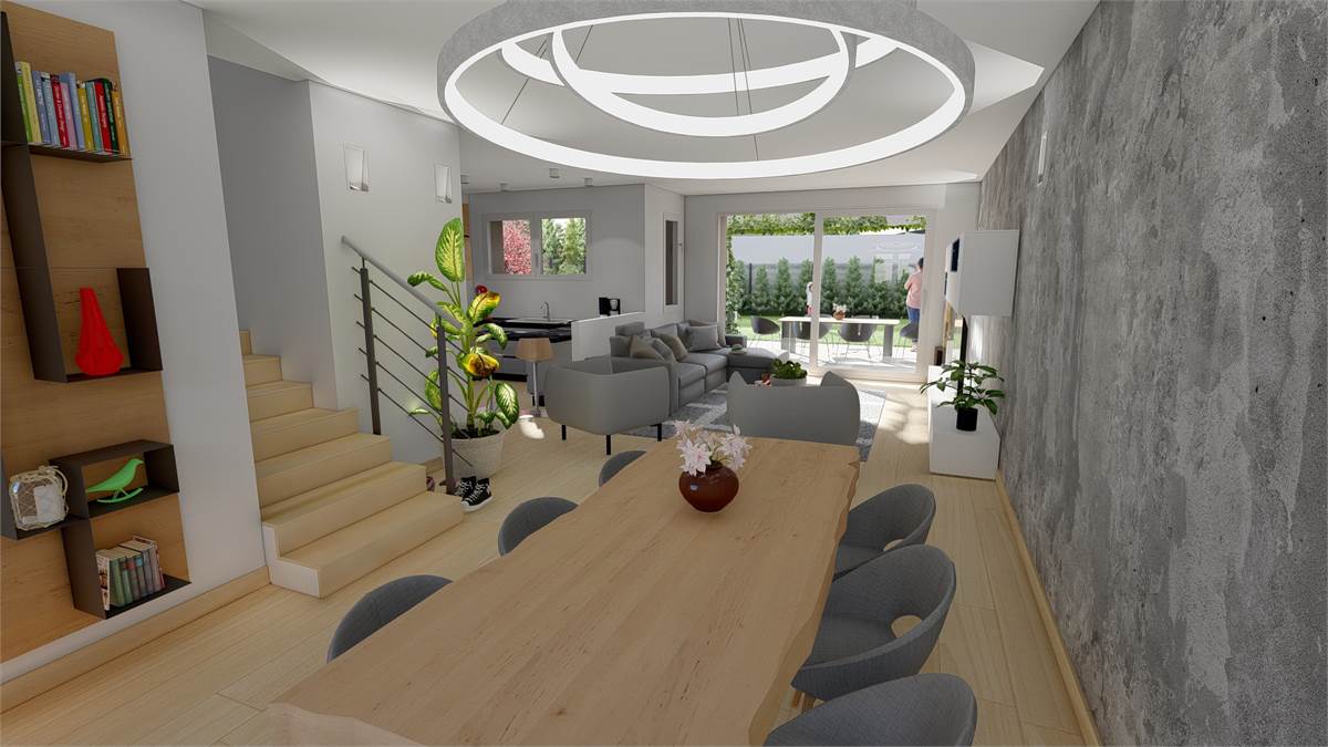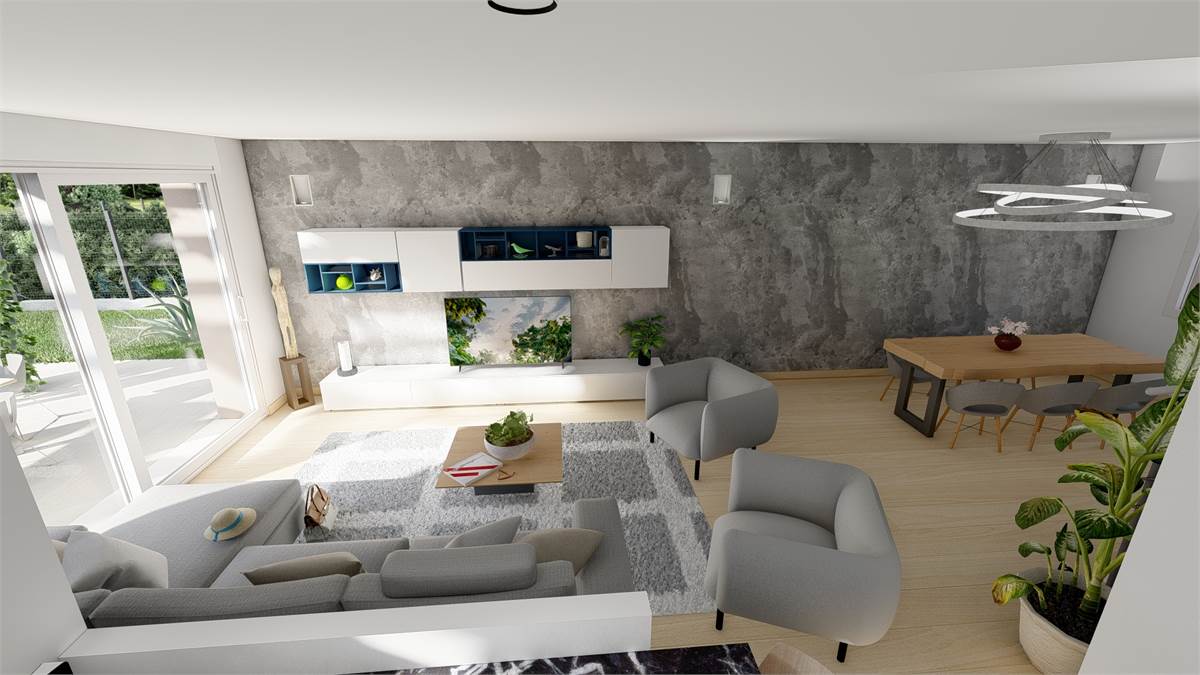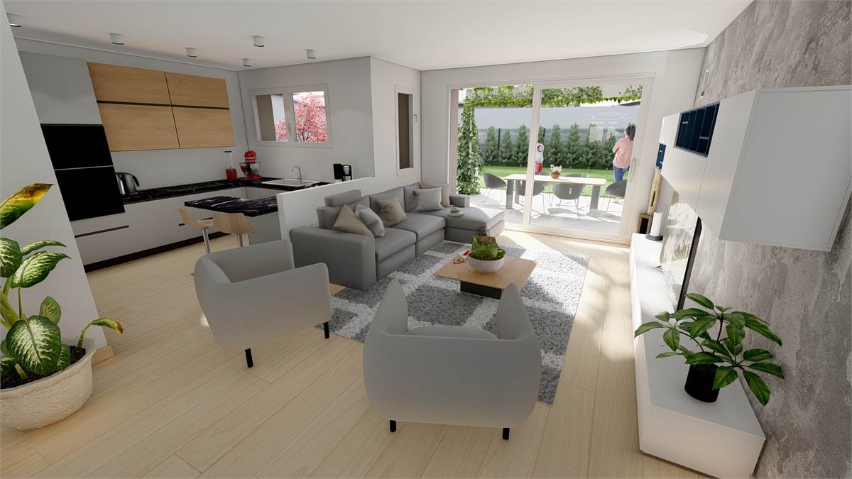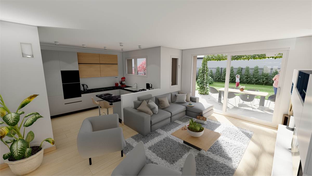 Al piano terra si apre un'ampia e luminosa zona living con cucina, caratterizzata da una grande finestra che garantisce continuità tra interno ed esterno, con accesso diretto al patio e al giardino privato di 350mq circa, ideale per momenti di relax e vita all'aria aperta e un bagno finestrato.