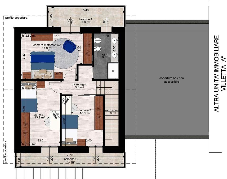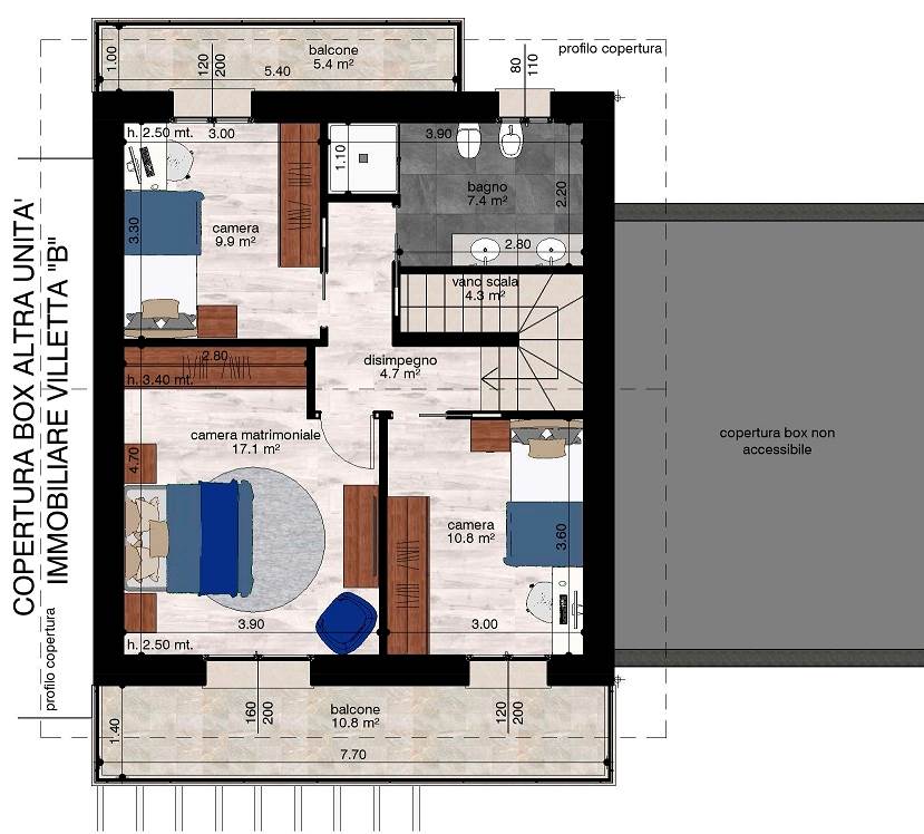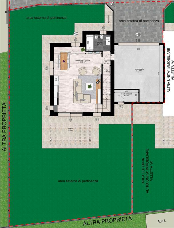 Completa la soluzione un grande box, collegato direttamente al piano terra all'abitazione tramite un disimpegno.