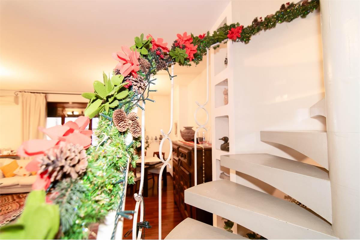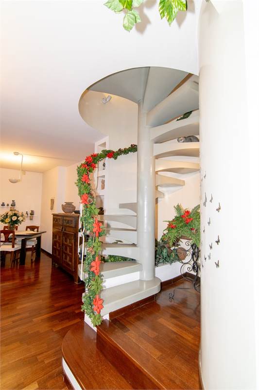 Dal soggiorno, tramite un'elegante scala si accede al secondo piano mansardato dove troviamo un ampio locale da adibire a proprio piacimento come studio, locale di svago o ulteriore camera, due ripostigli, una veranda coperta riscaldata ed un terrazzo. Interessante è la possibilità di aumentare la superficie della mansarda di altri 80 mq di pertinenza esclusiva all'abitazione, attualmente a rustico con colonne impianti portate al piano.