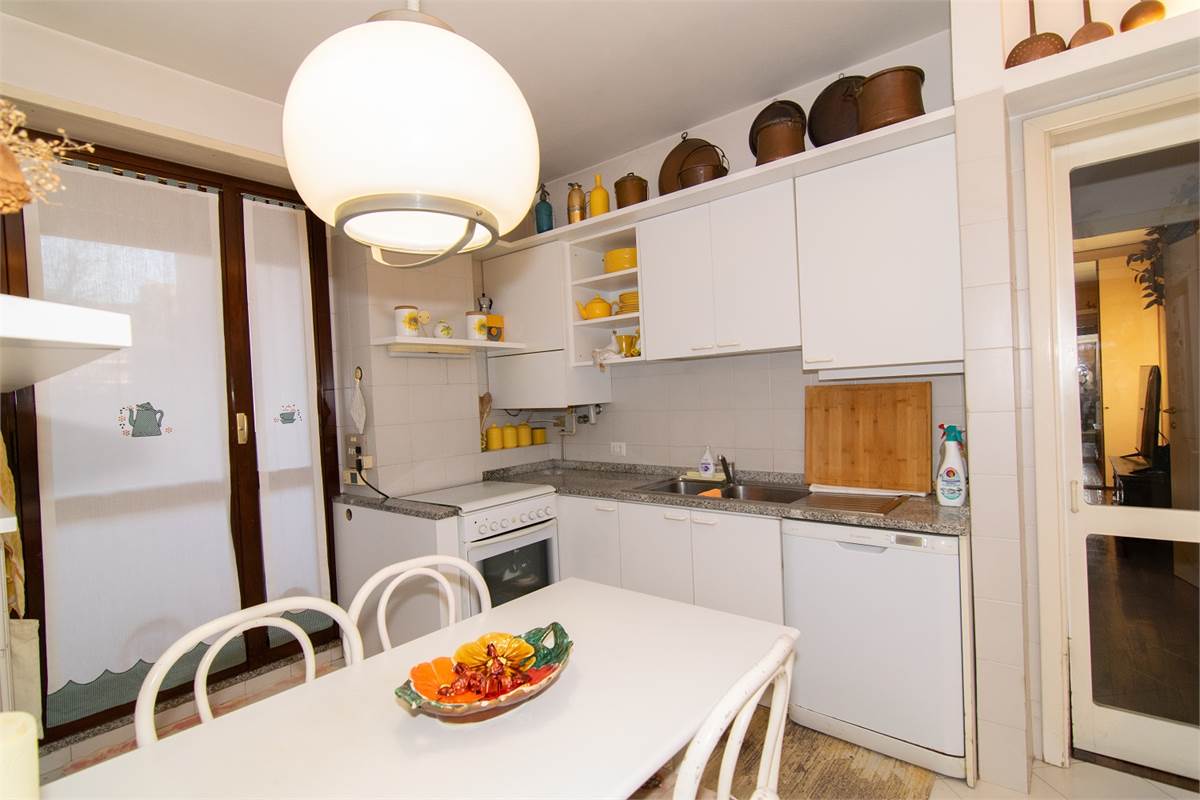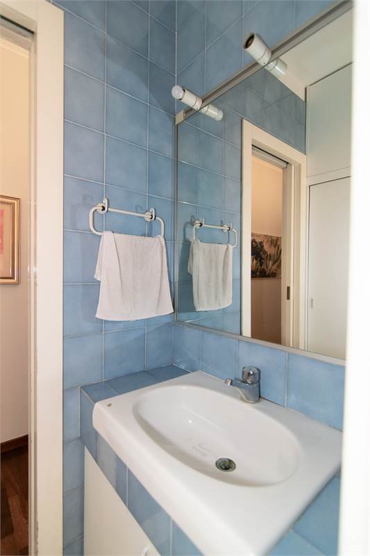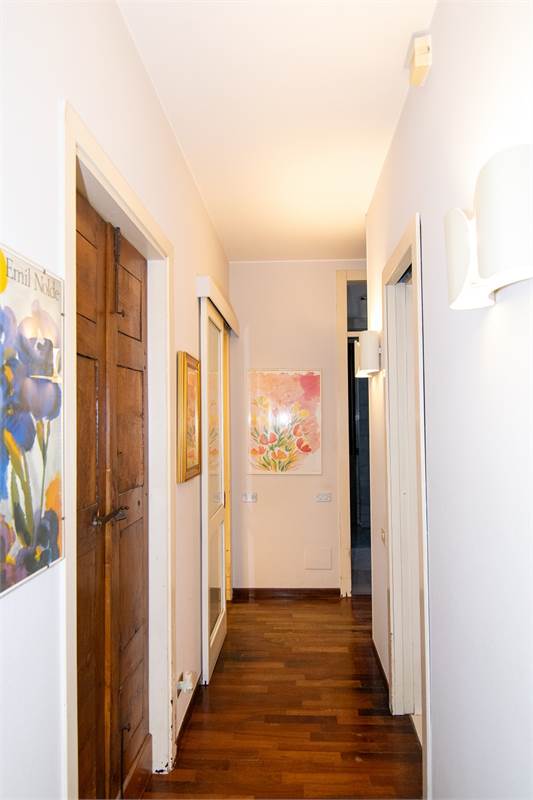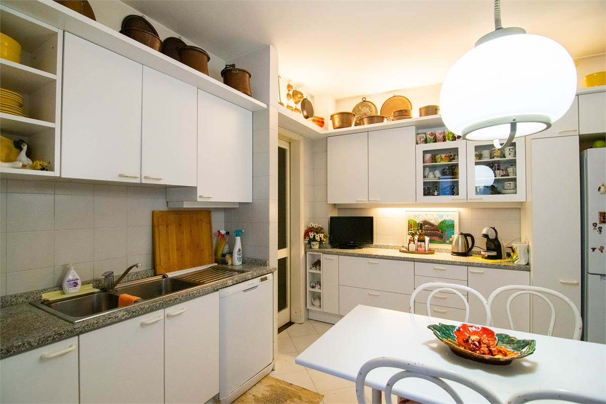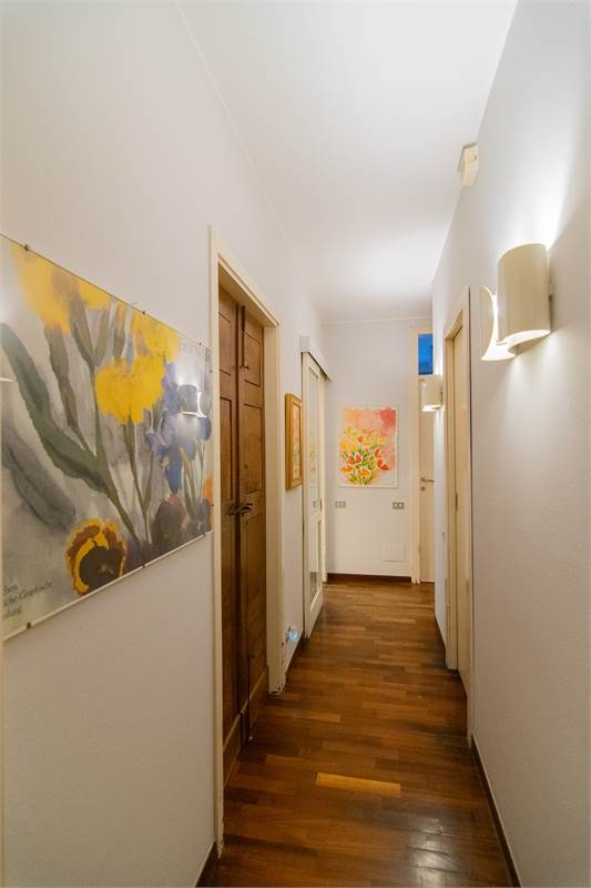 L'appartamento al primo piano è composto da un ingresso, un soggiorno doppio con accesso diretto sul terrazzo, una cucina abitabile con balcone, due camere, una camera matrimoniale con balcone, due bagni finestrati.