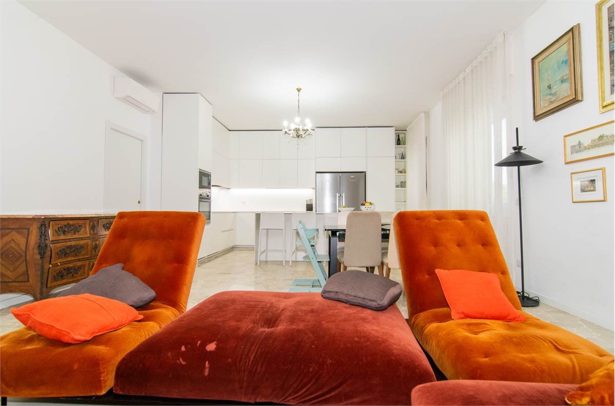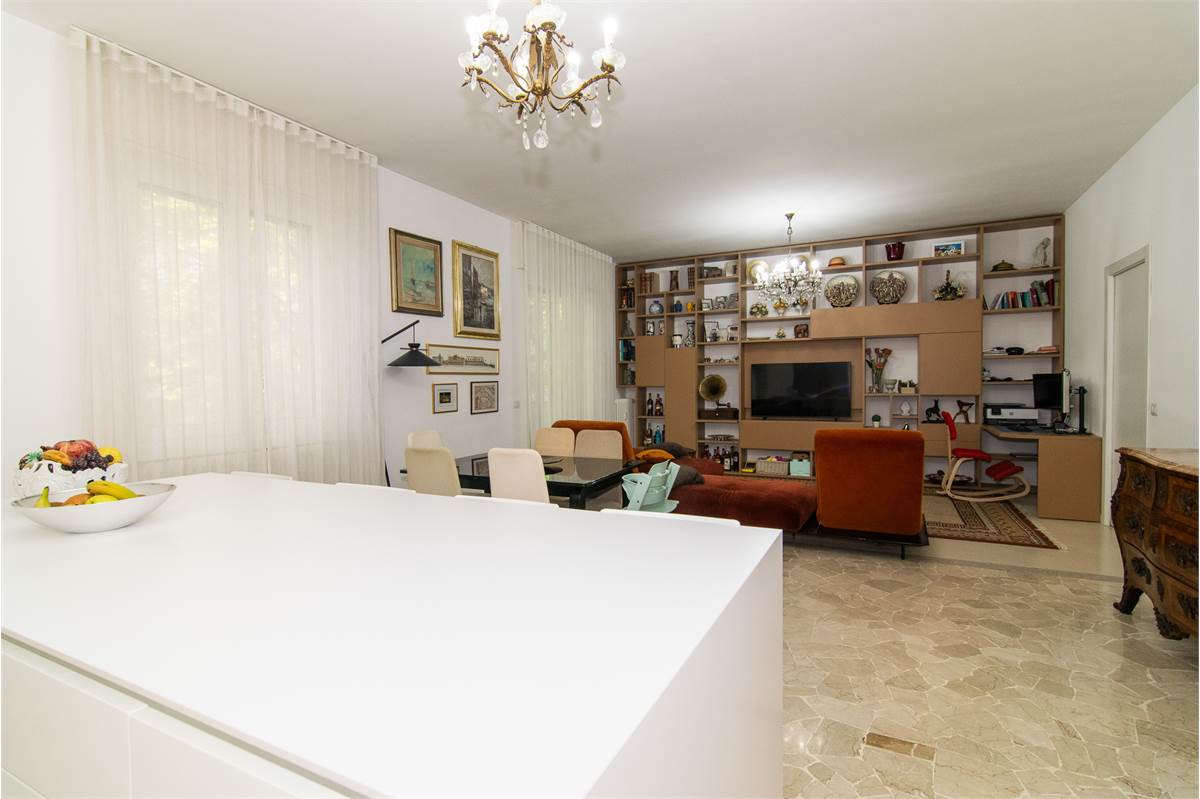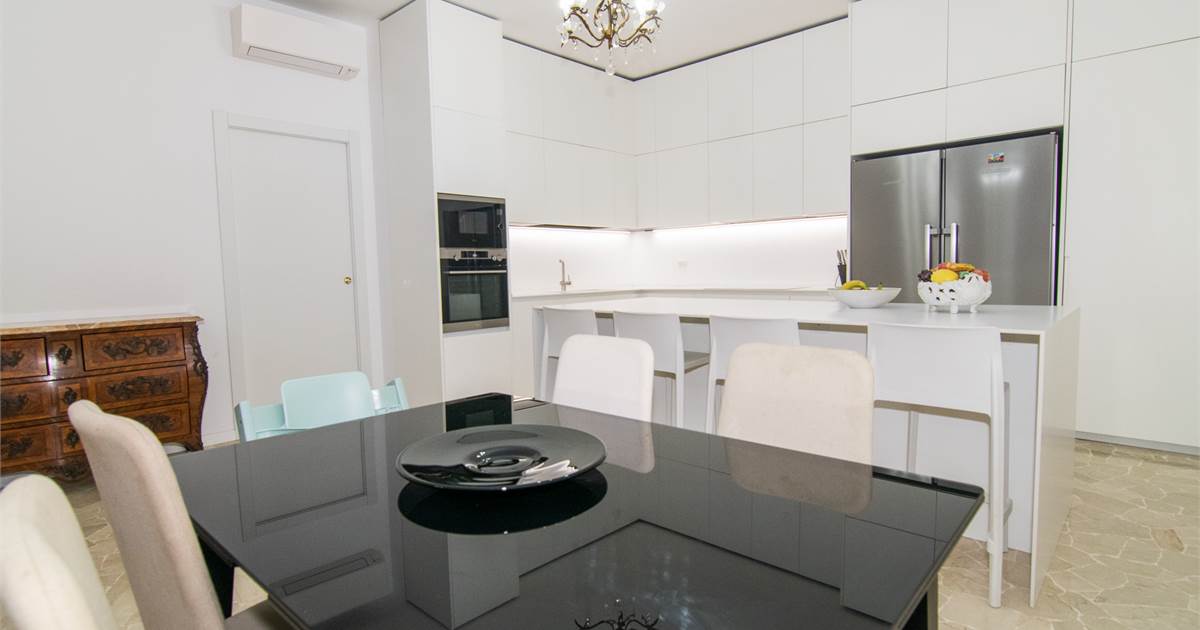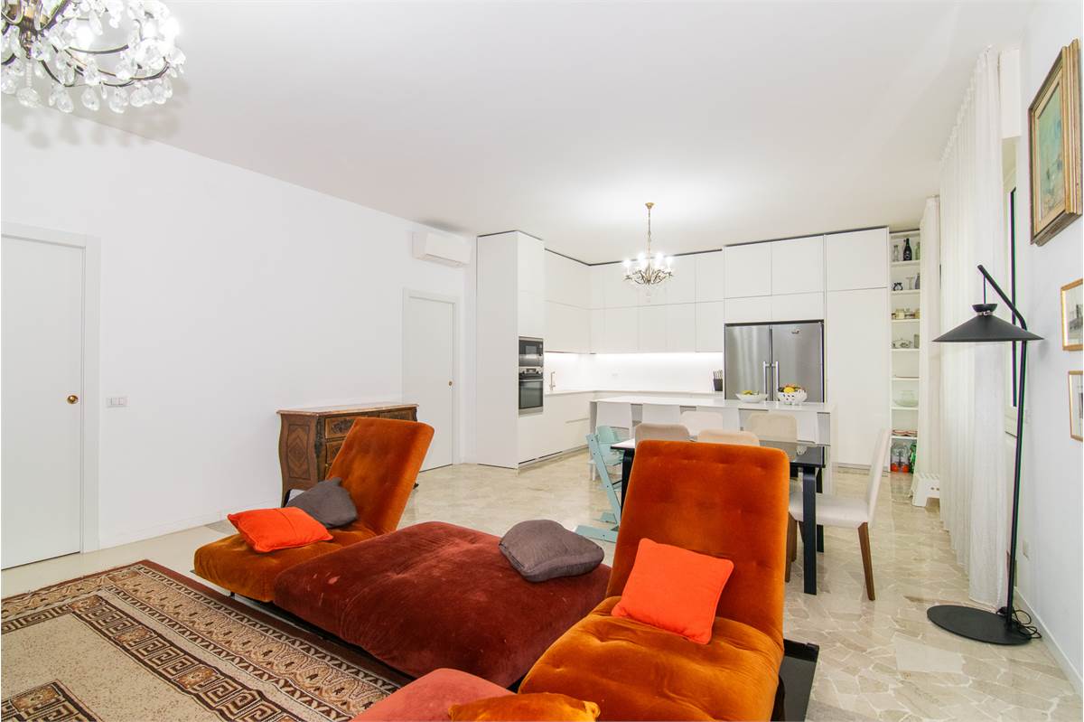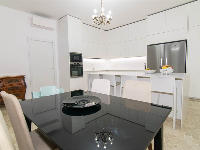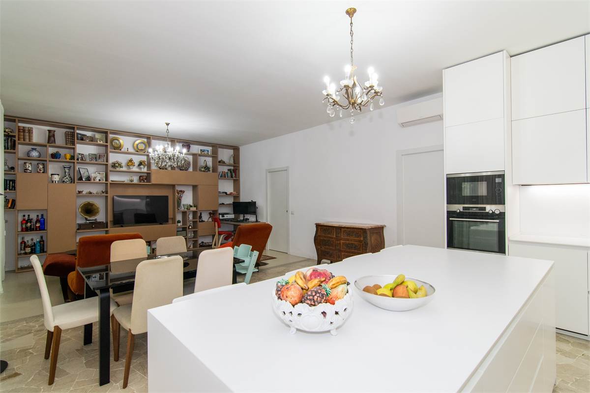 L’appartamento si distingue per un elegante salone con cucina a vista, un ambiente luminoso e accogliente con sfogo esterno su due balconi.