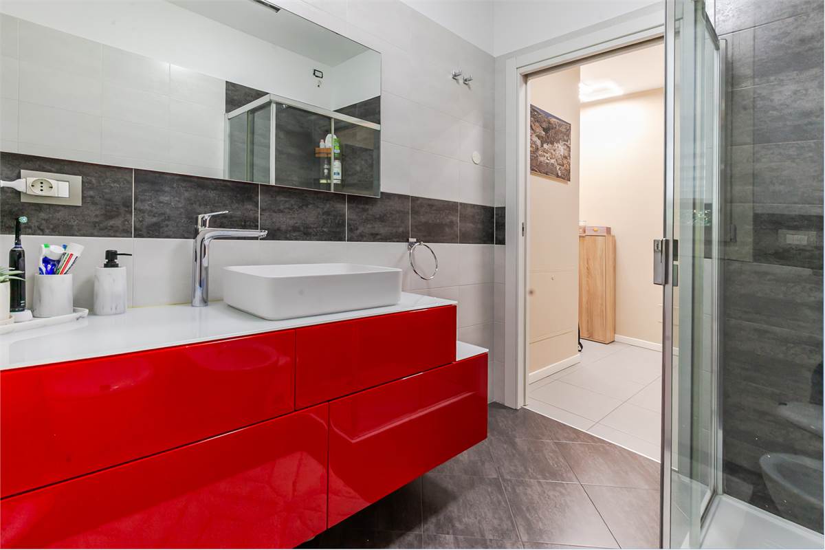 L'appartamento si presenta in ottimo stato, è presente l'impianto di condizionamento, il teleriscaldamento è centralizzato a pavimento con termostato autonomo, gli infissi sono dotati di doppi vetri in legno con tapparelle elettriche, allarme, pannelli solari, pavimentazione in gres porcellanato tutti gli ambienti e infine la porta d'ingresso è blindata.