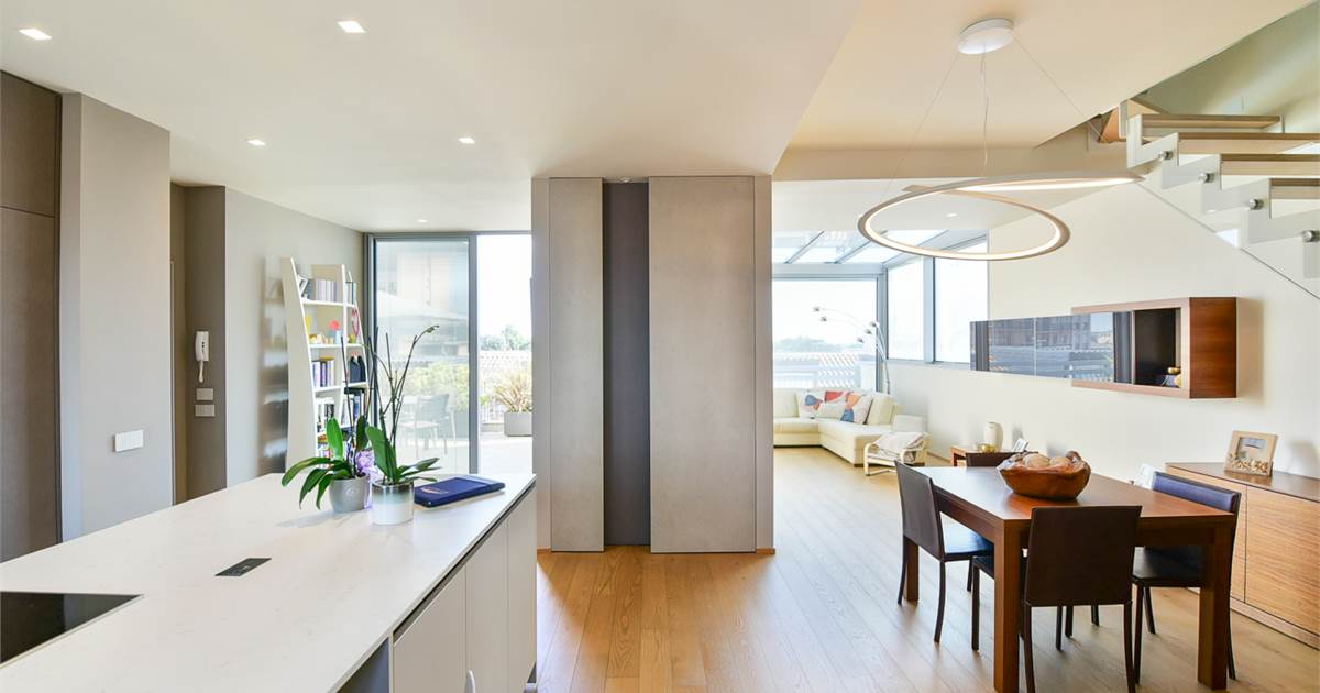 Il piano inferiore è dominato da un grande locale open space, dove la zona giorno si fonde in un'unica area di grande effetto. La cucina, moderna e funzionale, è perfettamente integrata nella sala da pranzo e nella zona living, creando un ambiente arioso e luminoso. La parte della zona giorno è stata realizzata con una serra bioclimatica, che non solo garantisce un notevole risparmio energetico, ma anche un ambiente sano e naturale.