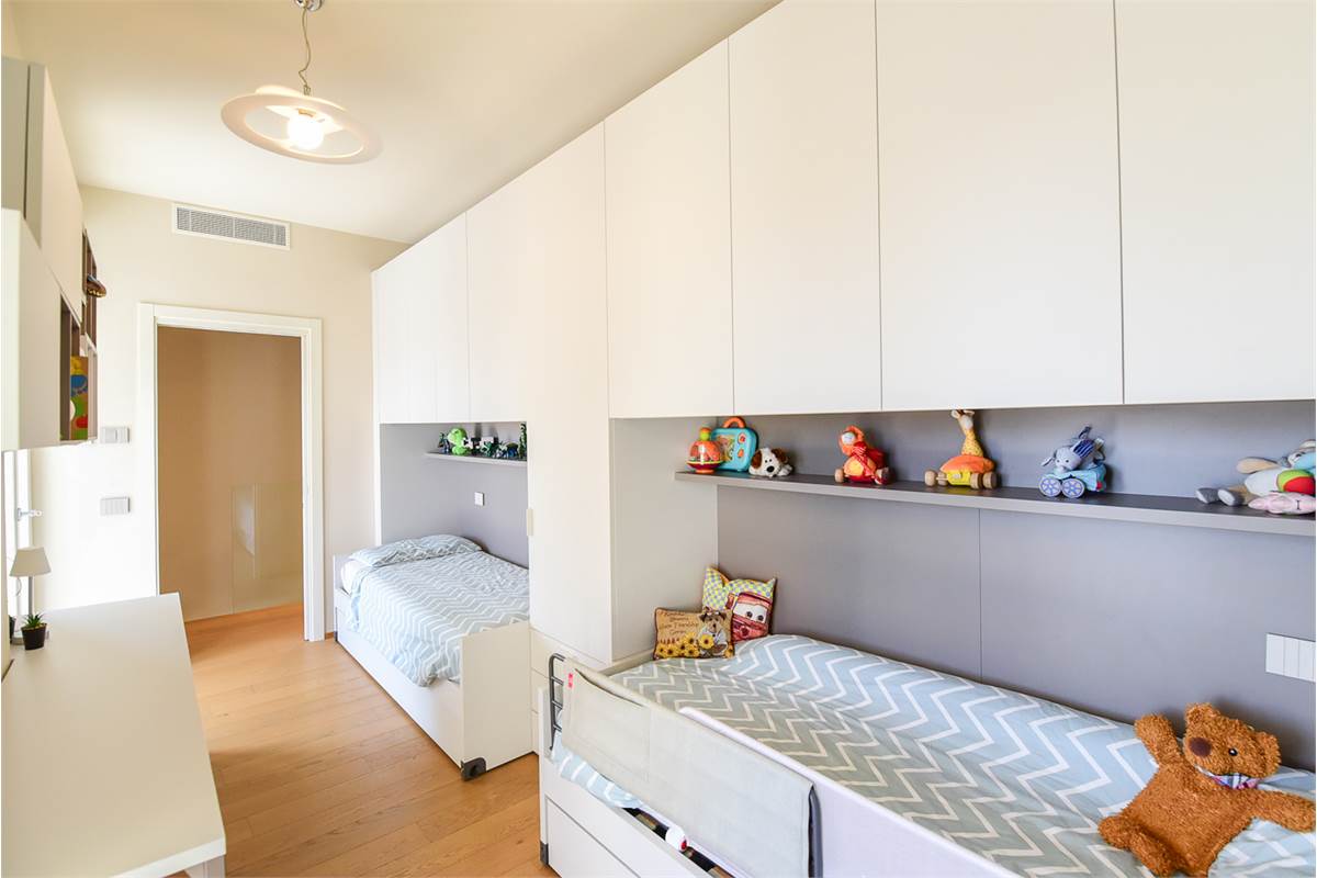 Il piano superiore, collegato al piano inferiore da una scala di design, è dedicato alla zona notte. Due ampie camere da letto, una matrimoniale e una singola, sono state progettate per garantire il massimo comfort e relax. Entrambe le camere da letto si affacciano una su un altro terrazzo e l altra su un balcone offrendo una vista panoramica sulla città e creando un'atmosfera di pace e tranquillità.