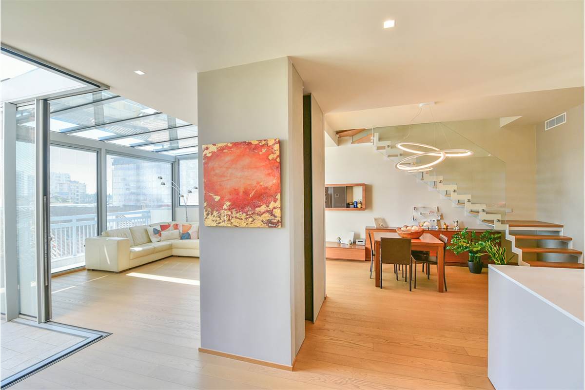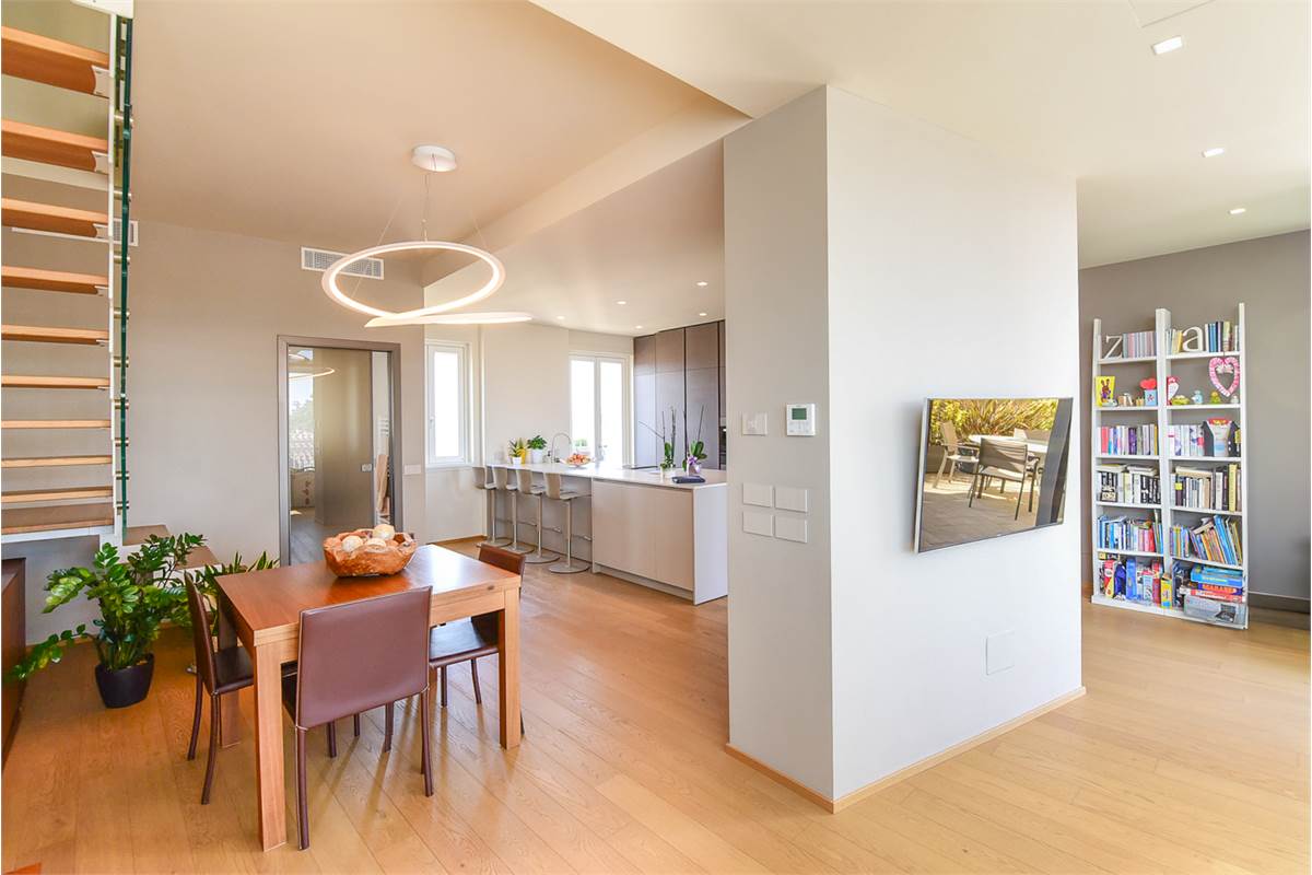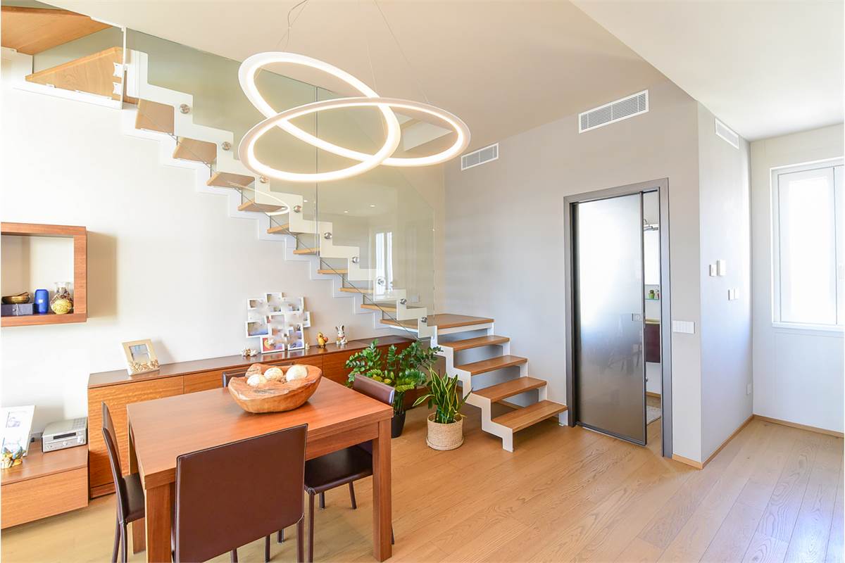 Il piano inferiore è dominato da un grande locale open space, dove la zona giorno si fonde in un'unica area di grande effetto. La cucina, moderna e funzionale, è perfettamente integrata nella sala da pranzo e nella zona living, creando un ambiente arioso e luminoso. La parte della zona giorno è stata realizzata con una serra bioclimatica, che non solo garantisce un notevole risparmio energetico, ma anche un ambiente sano e naturale.